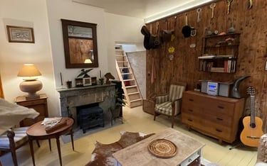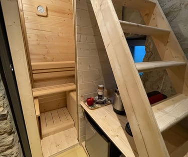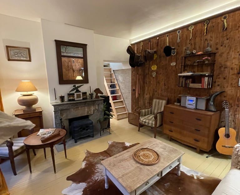 La sellerie, restée intacte avec ses porte-selles et les trophées des champions. Une pièce chaleureuse au confort moderne ; son poêle, son canapé, la salle de bain et le sauna. À l’étage une chambre avec vue sur le haras et les paddocks.
